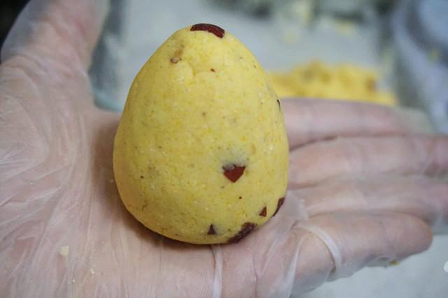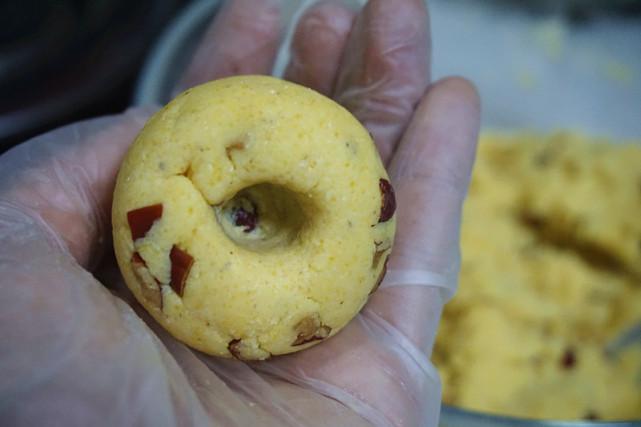 7、形状差不多出来了就右手拇指在窝头底下缓慢挤出一个孔洞,同时左手虎口固定顶部形状。