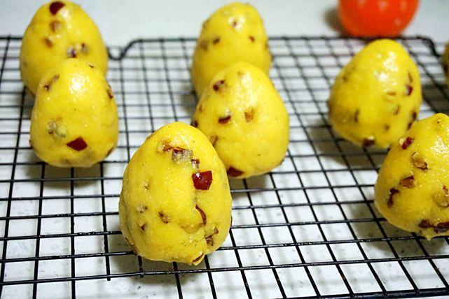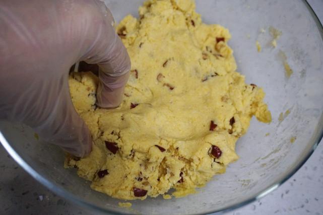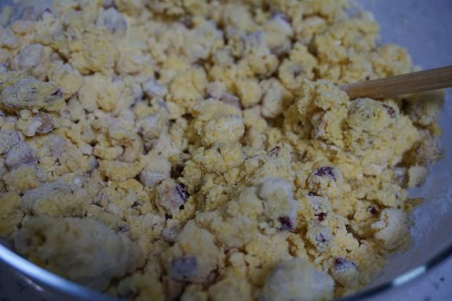4、混合后像这样,红枣和面都揉成小疙瘩了,就不要放牛奶了,开始捏面团,期间觉得干再少放牛奶。