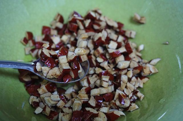 3、一般放白糖,来增加口感。不过也可以用红枣,口感比白糖的好吃太多。也是我一时兴起,切了红枣碎,用的小枣12个,这个不硬性要求,爱吃就多放。