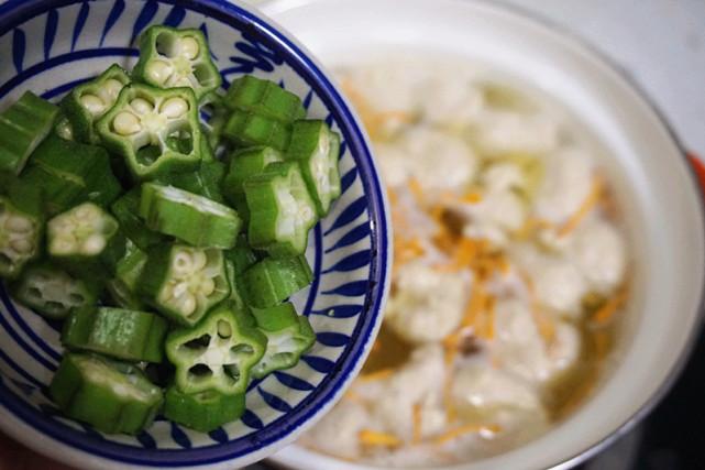 6、接着放入虫草花和秋葵,开锅加入少许盐即可。