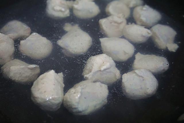 5、在沸水中,依次挤入的鸡肉糜,可以看到,根本没有沫子,入水即定型,这说明肉质被刀头打磨的非常细腻和均匀。