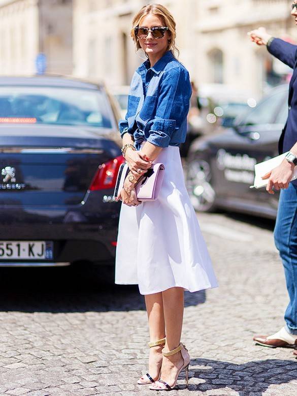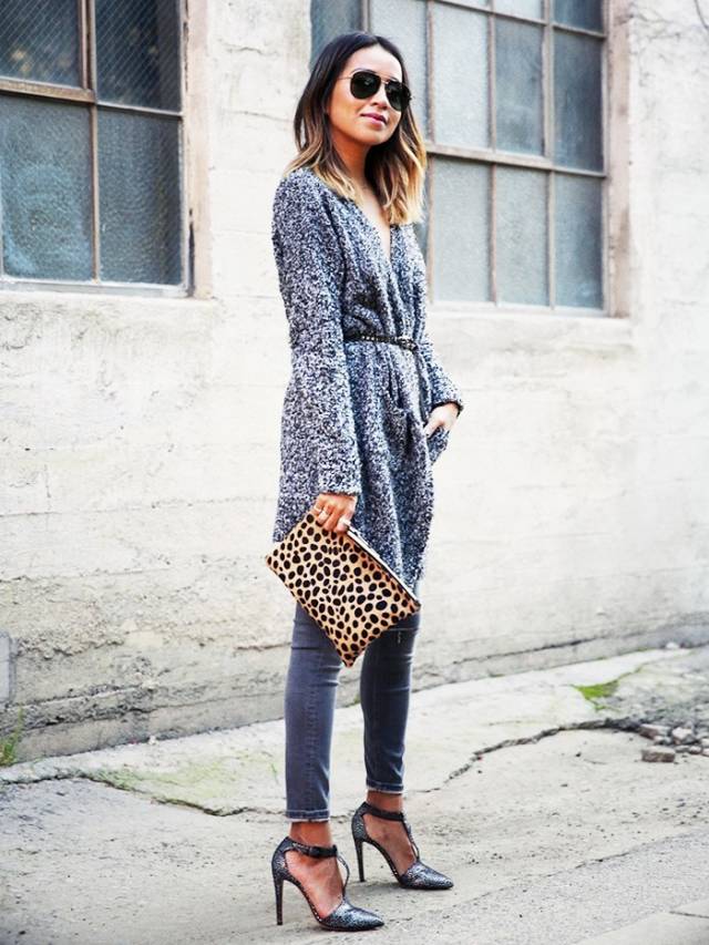 关於牛仔的搭配我们已经讲的太多,牛仔外套丶破洞牛仔裤最适合演绎率性味道,但如何把牛仔穿得有女人味?一件针织衫加牛仔裙是个不错的选择,另外高跟鞋也必不可少。