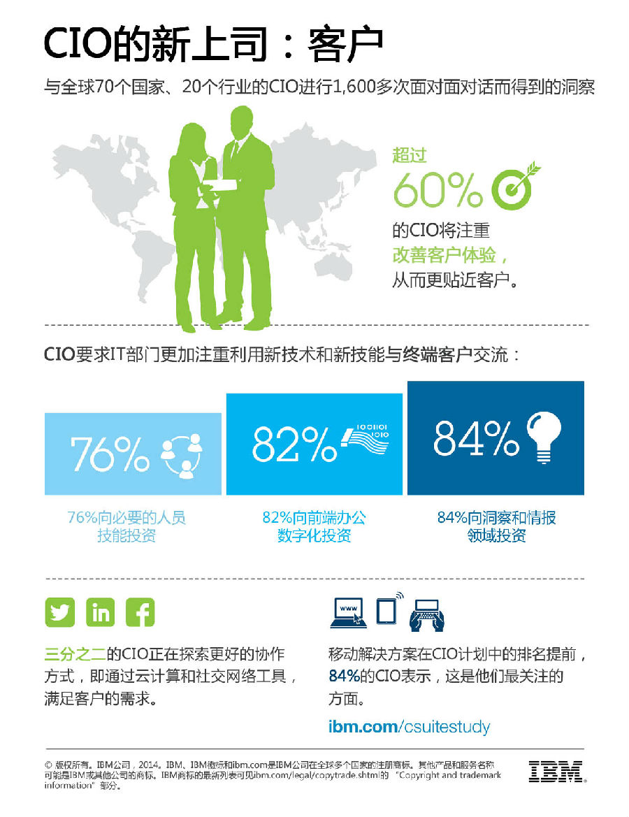 来自全球高级管理人员调研的CIO洞察》的报告是根据与全球70个国家、20个行业中的1,600多位CIO的面对面交谈而得来。由IBM商业价值研究院开展的调研指出,客户推动CIO将注意力转移到前线。