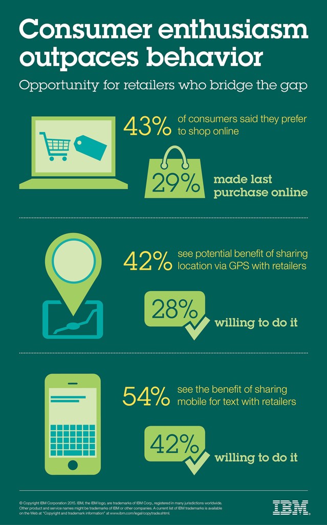 IBM在2015年美国零售联合会大会 (#NRF15) 上发布的一项新研究揭示,虽然消费者对网购以及对与零售商进行数字互动的热情越来越高,但实际行动却并未落实。这些发现表明消费者的期望未得到满足,这给零售商提供了弥合差距和提高顾客忠诚度的大好机会。