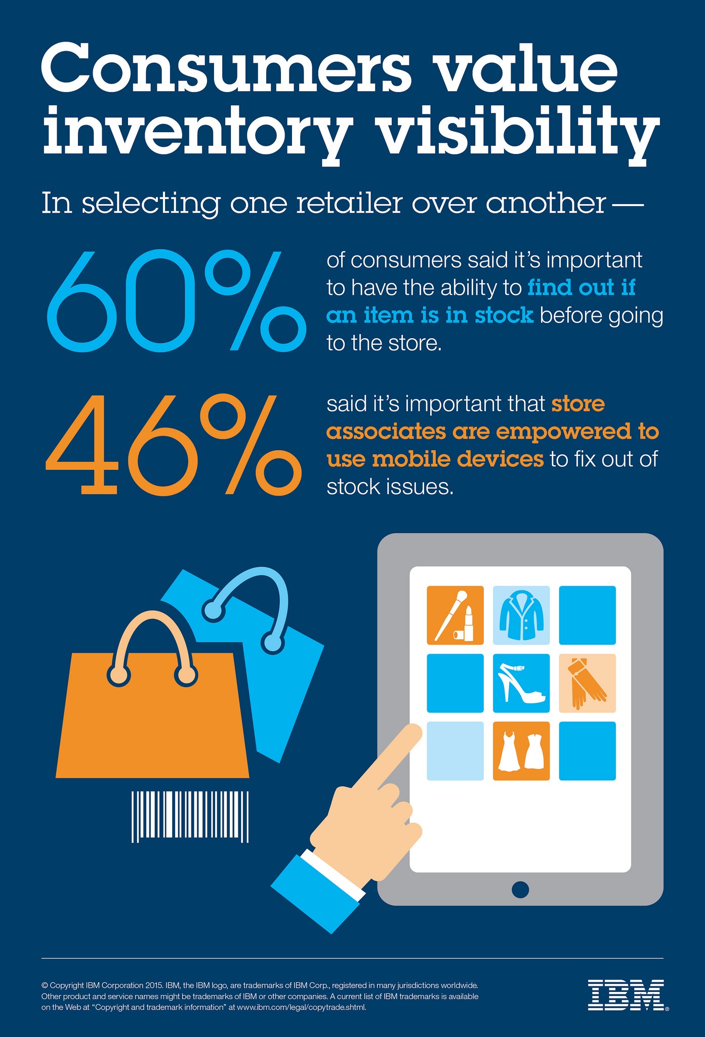 消费者的最大要求是存货能见度。因为消费者对产品的期望是根据在线购物体验建立起来的,所以缺货现象让他们觉得难以接受。60%的被调查消费者表示,在前往商店之前能够查明某商品是否有存货对他们很重要。46%的消费者表示,零售业员工使用移动设备来解决缺货问题很重要,这比去年上升了6个百分点。