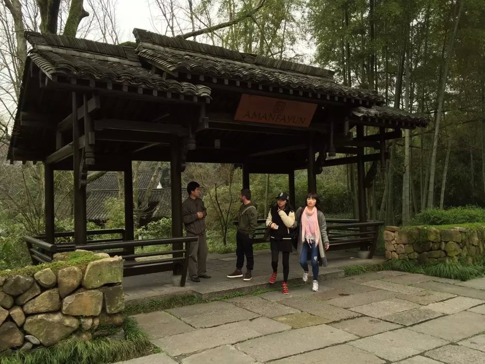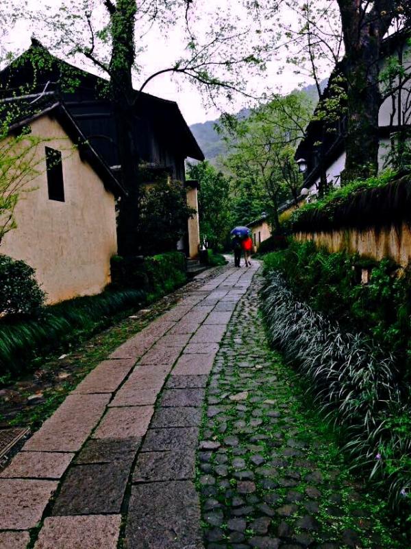 在这条修竹婆娑道路上,人的心情随着环境的变化,也变得宁静起来。虽然不时还有汽车擦肩而过,比起喧哗的西湖“三堤”,己有天壤之别了。在《安缦·法云》牌坊前,我在揣摸着曾经的“法云村”,到底是一幅怎样的画图?