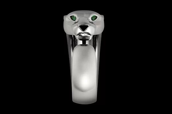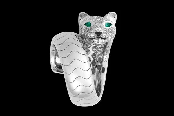 白18K金戒指,钻石铺镶猎豹装饰,祖母绿豹眼,黑漆豹鼻。