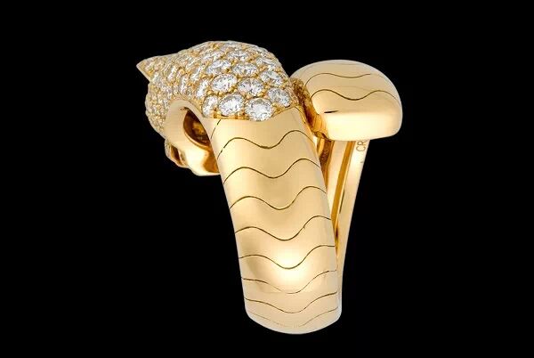 18K黄金戒指,饰有钻石,猎豹装饰,镶嵌沙弗来石豹眼,缟玛瑙和黑漆豹鼻。