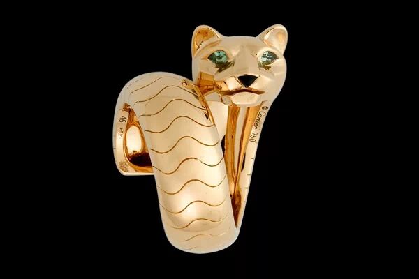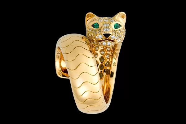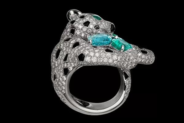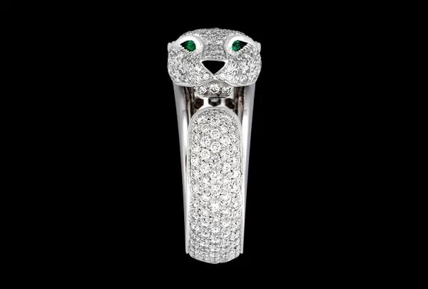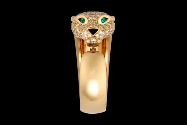18K黄金戒指,豹头密镶钻石,2颗祖母绿豹眼和缟玛瑙豹鼻。