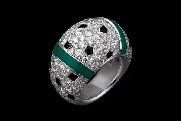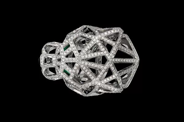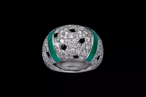 Cartier戒指,白18K金,镶嵌404颗圆形明亮式切割钻石(2.60克拉)、祖母绿和缟玛瑙。