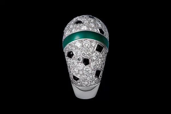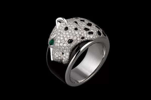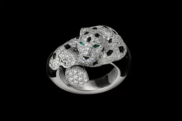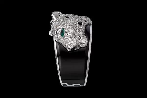 Panthère de Cartier戒指,白18K金,黑漆,镶嵌208颗圆形明亮式切割钻石(0.80克拉)、祖母绿和缟玛瑙。