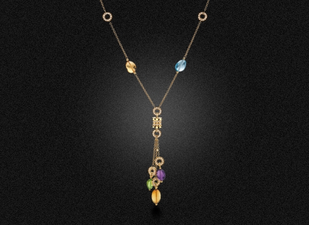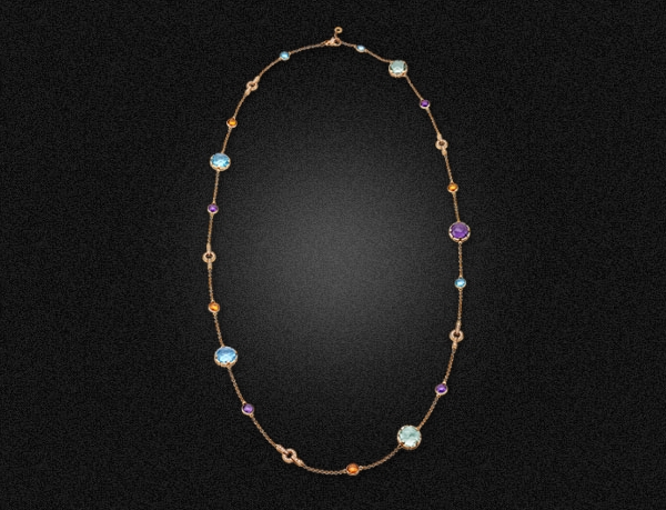 Cocktail长款项链,18K玫瑰金材质,镶嵌蓝色托帕石、绿水晶、黄水晶和紫水晶,饰以密镶钻石。长度93厘米。http://mmbiz.qpic.cn/mmbiz/osv7xnooomGhhBP8J3wRG93SxXgPDCspBvcSTNrgxF6j8Zy9wVZl7jtxre5QwjzoXPcAoUdqzubtp5sNEicHNrQ/0?wxfrom=5宝格丽经典之彩宝款(全集)" TITLE="【珠宝知识】