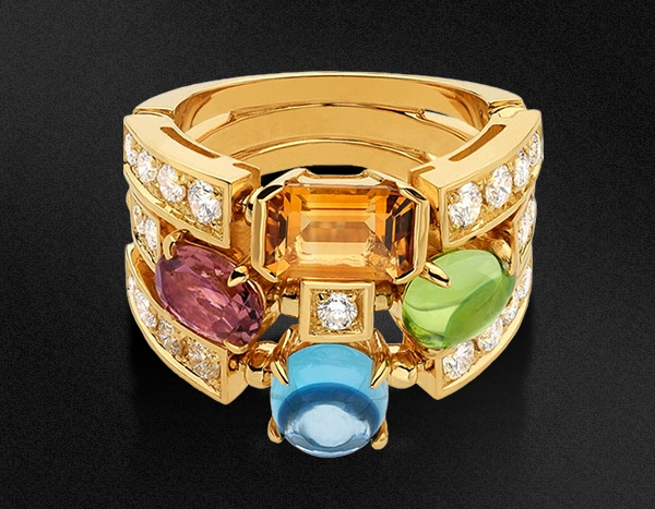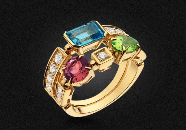 Collection三环戒指,18K黄金材质,镶嵌粉红碧玺、橄榄石、黄水晶和蓝色托帕石,饰以密镶钻石。http://mmbiz.qpic.cn/mmbiz/osv7xnooomGhhBP8J3wRG93SxXgPDCspLMLcicuLvMc7sH4VgllExpqWpu4Lwc03dFeSr8QlqneicV1AvdFjS2OQ/0?wxfrom=5宝格丽经典之彩宝款(全集)" TITLE="【珠宝知识】