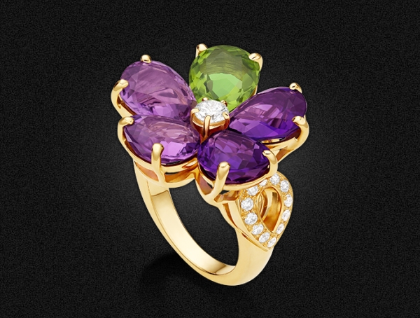 Sapphire Flower 18K黄金戒指,配紫水晶、橄榄石和密镶钻石。http://mmbiz.qpic.cn/mmbiz/osv7xnooomGhhBP8J3wRG93SxXgPDCspYTY9U8VcfdljBxIrf579E1Qzv7X2d2PCH3noO4TC3H6YHjDw6N8aoA/0?wxfrom=5宝格丽经典之彩宝款(全集)" TITLE="【珠宝知识】