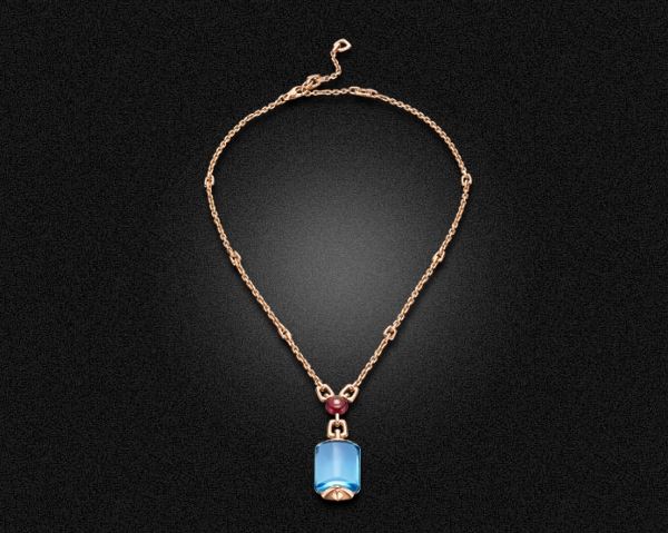 MVSA项链,18K玫瑰金材质,镶嵌蓝色托帕石、红碧玺珠和钻石。长度17.71英寸 (45厘米)。http://mmbiz.qpic.cn/mmbiz/osv7xnooomGhhBP8J3wRG93SxXgPDCspbloicWX0SCNCcAjfkDSSx77HsvicAnubkvEeQxGcukeNuYVDicgOYlv6g/0?wxfrom=5宝格丽经典之彩宝款(全集)" TITLE="【珠宝知识】
