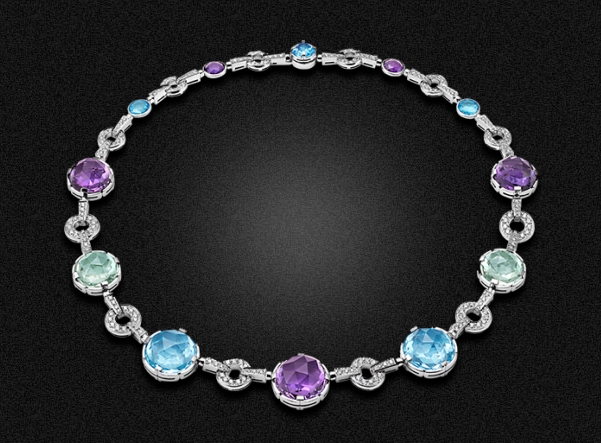 Cocktail项链,18K白金材质,镶嵌蓝色托帕石和紫水晶,饰以密镶钻石。长度38-42.5厘米。http://mmbiz.qpic.cn/mmbiz/osv7xnooomGhhBP8J3wRG93SxXgPDCspJsfqtXB3icKn8FWhuhwoCfQibq3kGcHrpNHn0zIOfuhg0PezNeSpLJ5A/0?wxfrom=5宝格丽经典之彩宝款(全集)" TITLE="【珠宝知识】