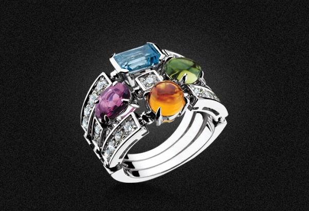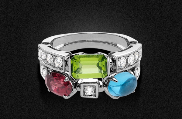 Collection双环戒指,18K白金材质,镶嵌橄榄石、红色石榴石和蓝色托帕石,饰以密镶钻石。http://mmbiz.qpic.cn/mmbiz/osv7xnooomGhhBP8J3wRG93SxXgPDCspuW9UHWfqxLE7wSt8avWCibmN8lGZSPCIlrq0wMZzl42a1hqicd9MXTow/0?wxfrom=5宝格丽经典之彩宝款(全集)" TITLE="【珠宝知识】