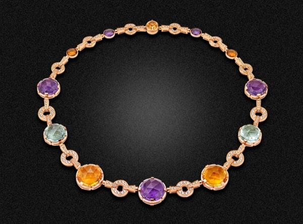 Cocktail单排项链,18K玫瑰金材质,镶嵌绿水晶、黄水晶和紫水晶,饰以密镶钻石。长度39厘米。http://mmbiz.qpic.cn/mmbiz/osv7xnooomGhhBP8J3wRG93SxXgPDCspzRbXmicUib3EibPJrAEfEgC9tm98cZMHe12gD3icWULAHQO2QCOHuw153A/0?wxfrom=5宝格丽经典之彩宝款(全集)" TITLE="【珠宝知识】