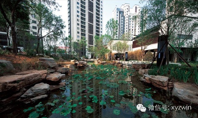 总之,在整个社区中沿着中轴游赏,东侧是山水画,是林间、鸟语、静潭勾画的风景;西侧则像谐趣图,充满了庭院深深的感觉,曲径通幽、步移景异,富于变化、充满情趣。