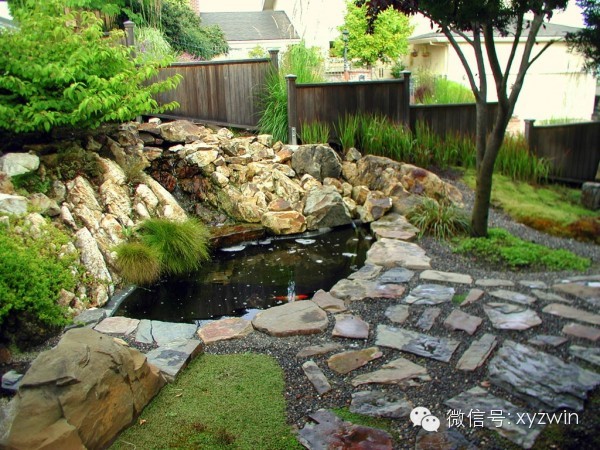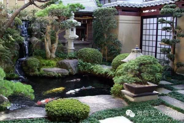 锦鲤鱼池是日本花园中另一个十分常见的元素。它们代表湖泊或海洋,给花园带来了色彩与生命。如下图所示,在休闲区会有大型的锦鲤鱼池,自家后院也容纳得下小的鱼池。