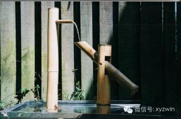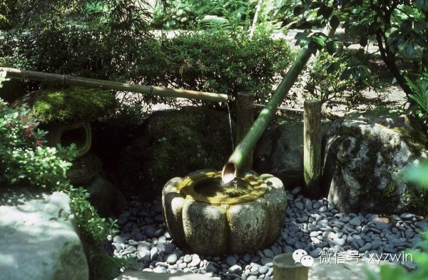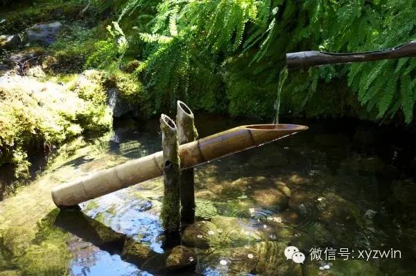 鹿威(学名)也叫添水,这些独特的水景的特性运用于花园之中是为了驱赶可能会破坏园林的鸟群和动物。当竹筒里缓缓蓄满流水,向下翻倒,敲击在池塘边的石头上,发出清脆“嘟”的一声,将水倒入池塘里,接着又弹起,循环往复。竹筒撞击在岩石上发出的声音就是所谓的恐吓战术。