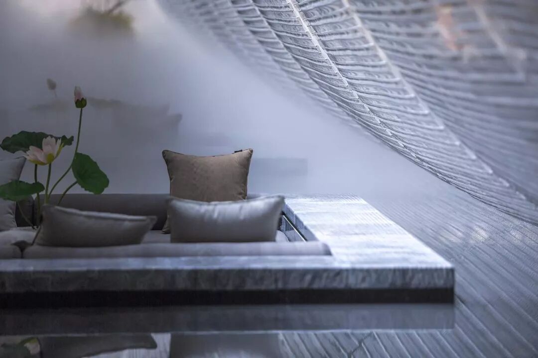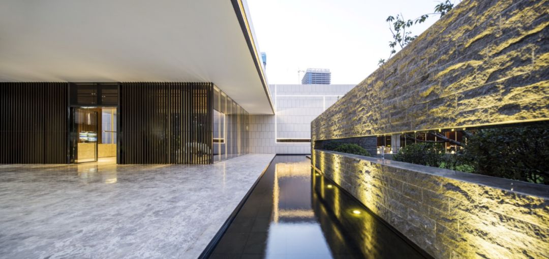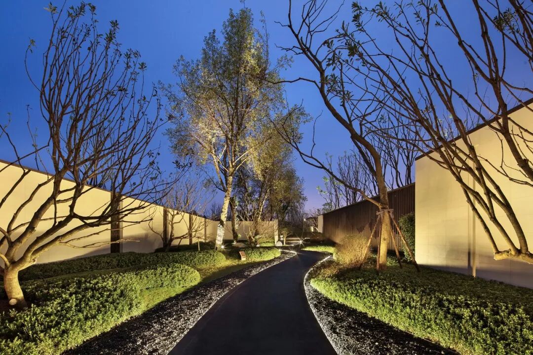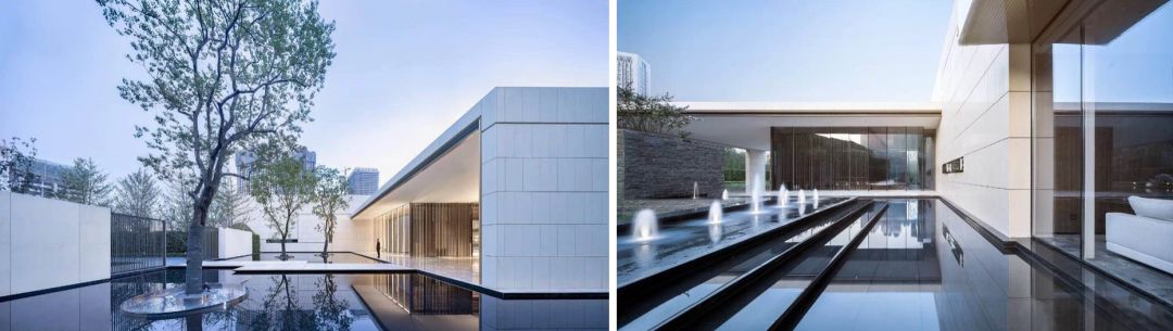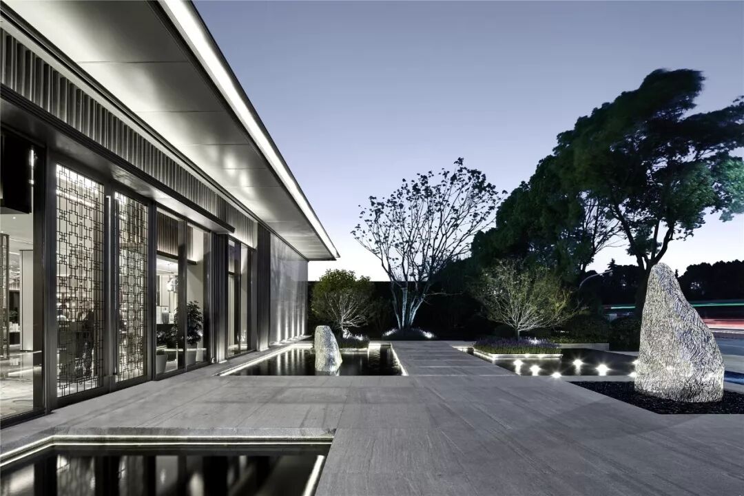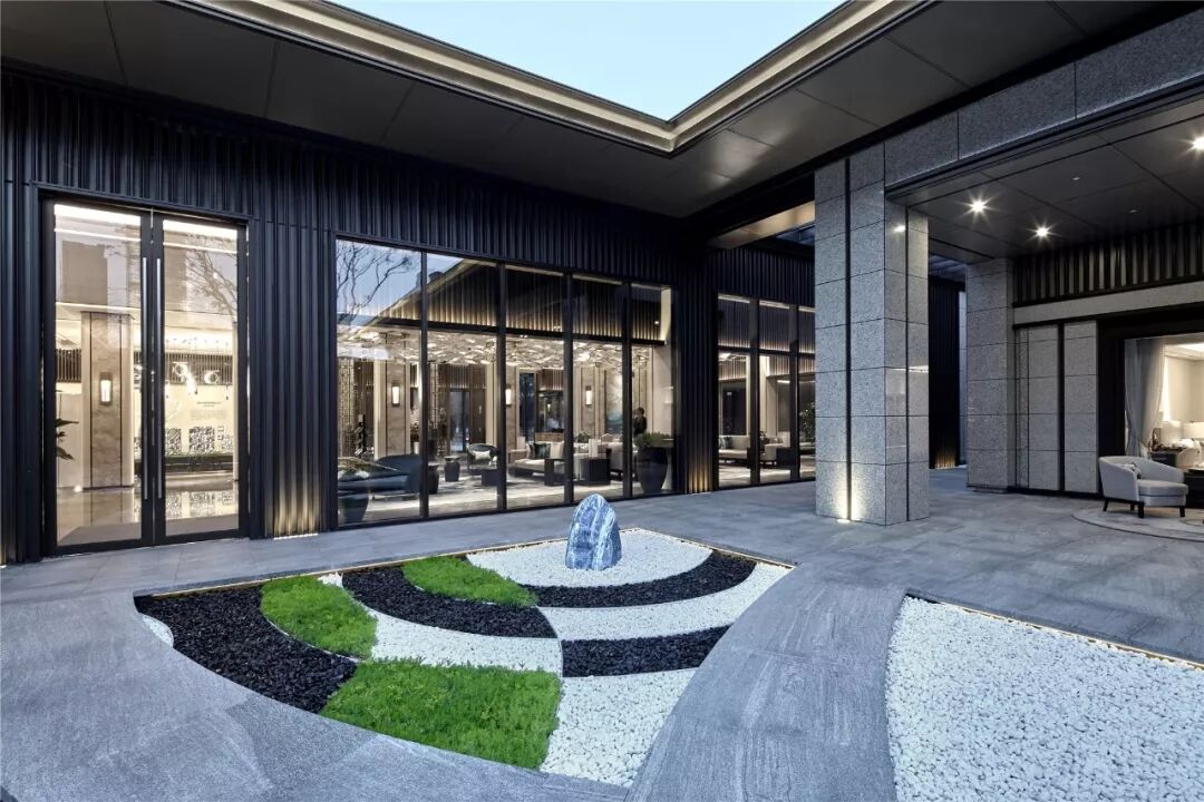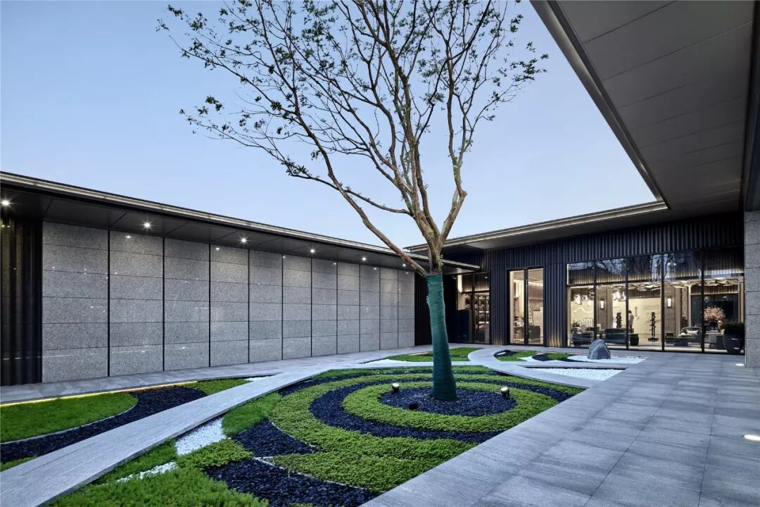 宁波逸树示范区设计重笔在“灰”,灰色中富有变化,含而不露,营造出一种质感空间,平衡着黑白界限分明的强烈对比。灰色格调里,隐喻着自然世界,内部庭院和夹廊布景呈现出一种“枯山水”式的微缩园林意境:静谧、深邃。