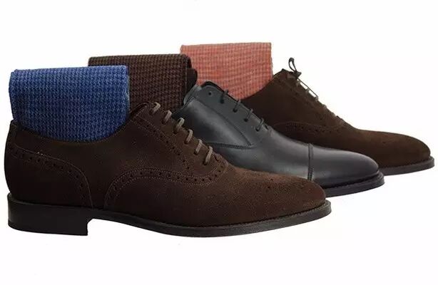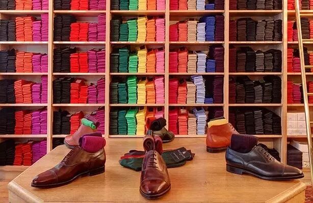 Rouges店内除了纯色袜子之外,还有千鸟格、人字纹、波尔卡点、横竖条纹等各种花纹袜子可供选择,适合打造更具趣味的绅士造型。