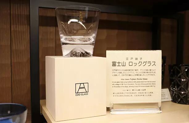 使用相同的传统江戸切子工艺制作而成的富士山玻璃杯,杯子底部有着著名的富士山设计。如果在杯中倒入红茶的话,杯底便会呈现出画家们最爱的、沐浴在朝日或暮日光辉中的葛饰北斋标志性红色富士山设计。