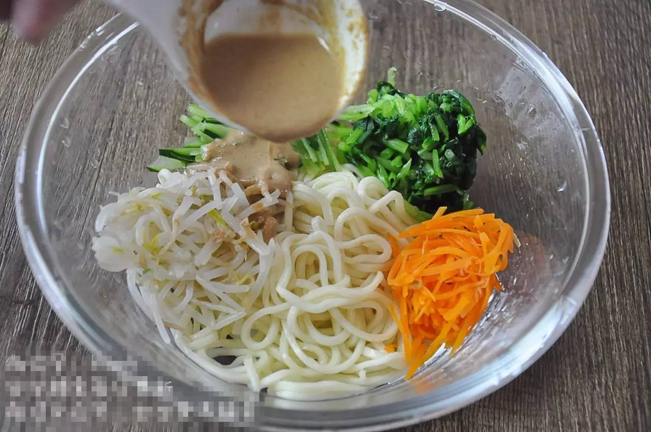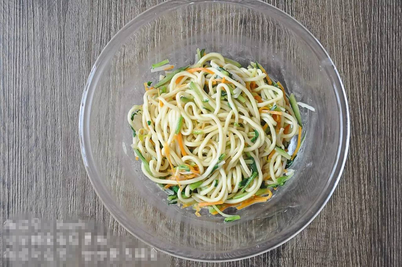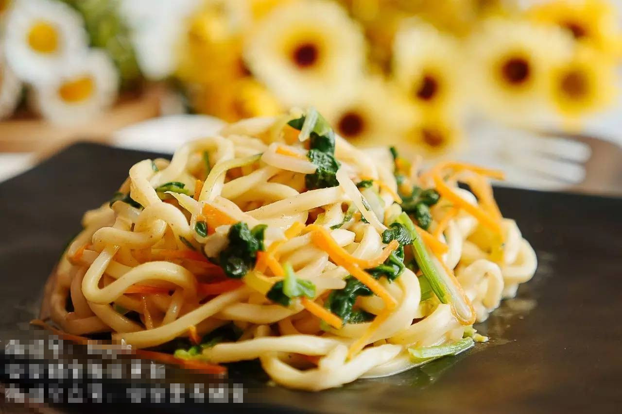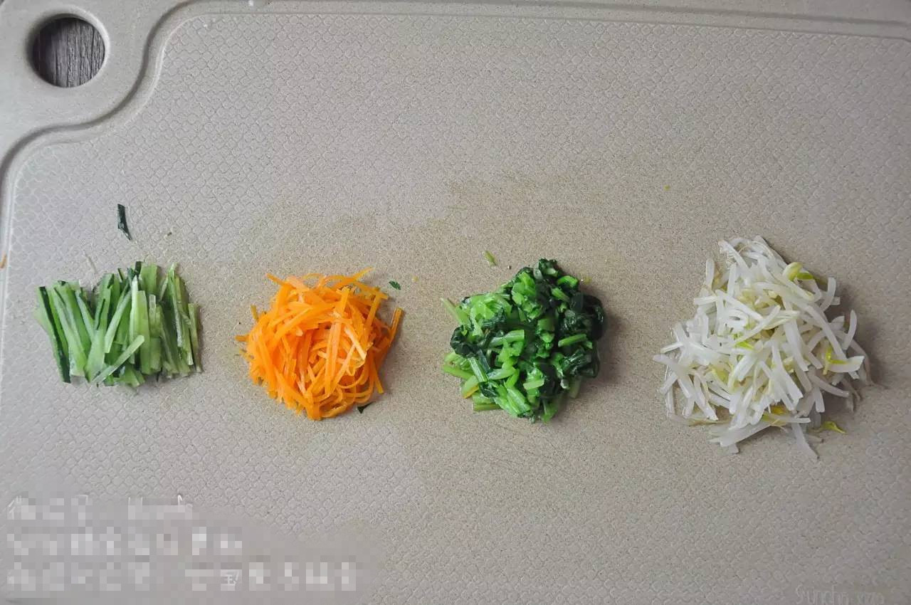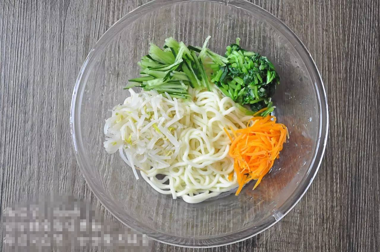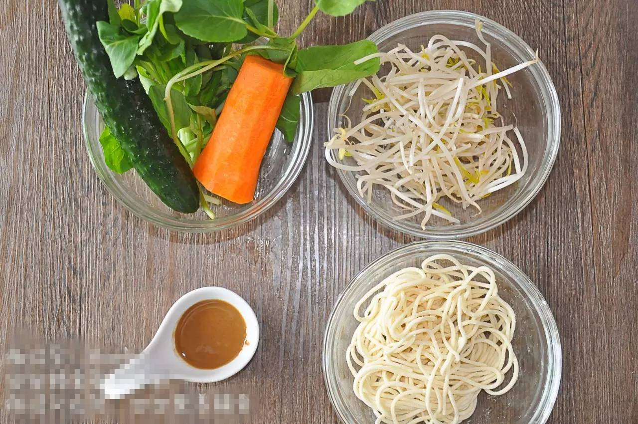 配方:面条70g、鸡毛菜40g、绿豆芽40g、黄瓜20g、胡萝卜20g