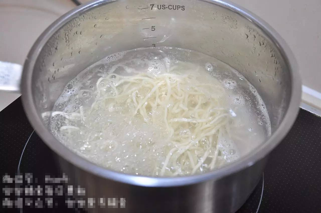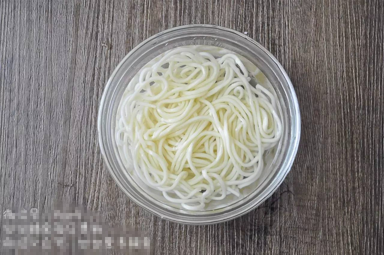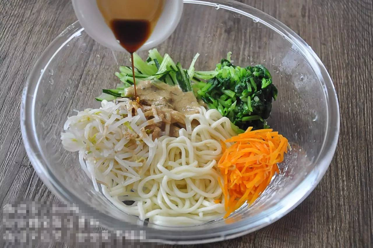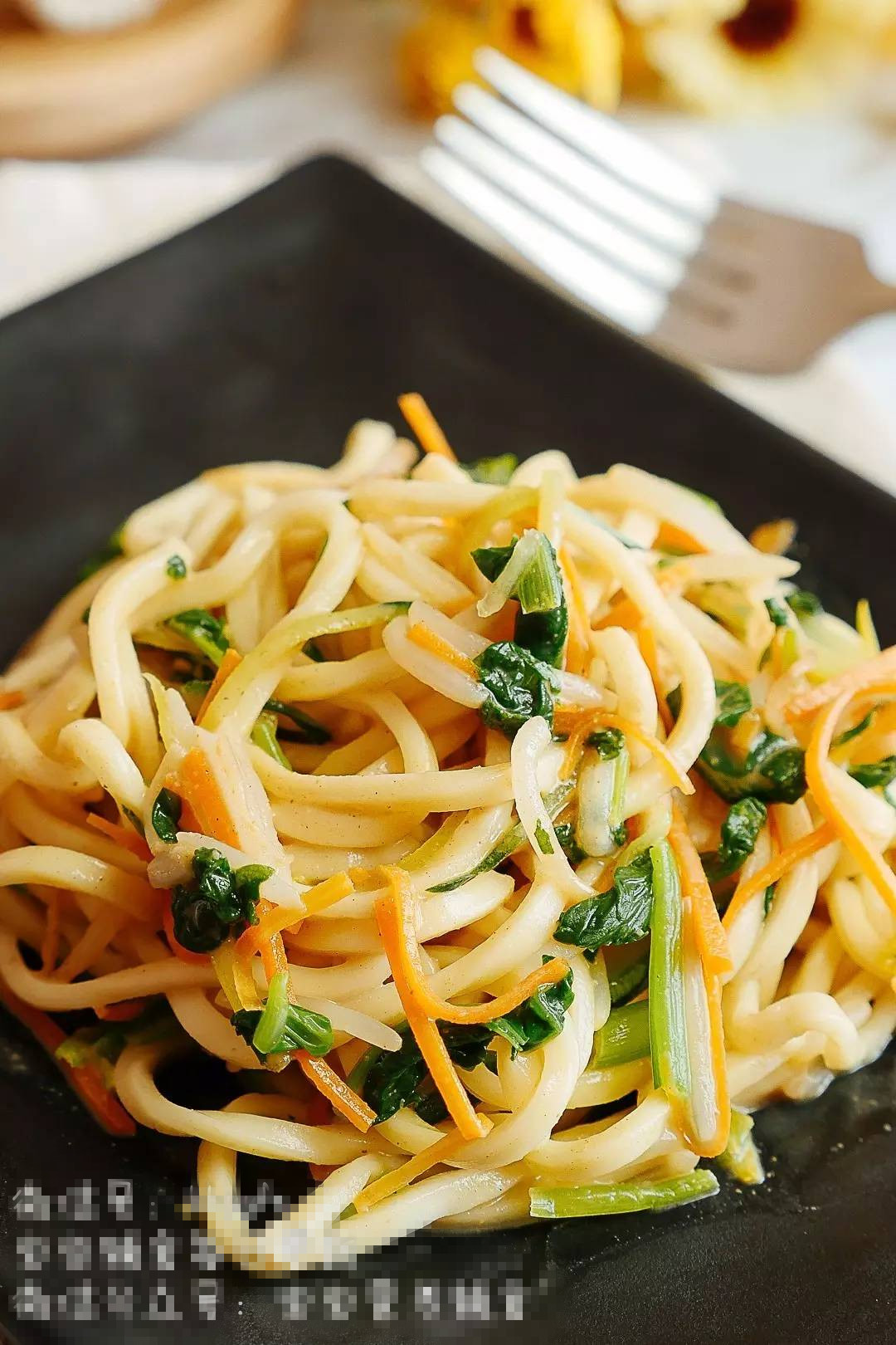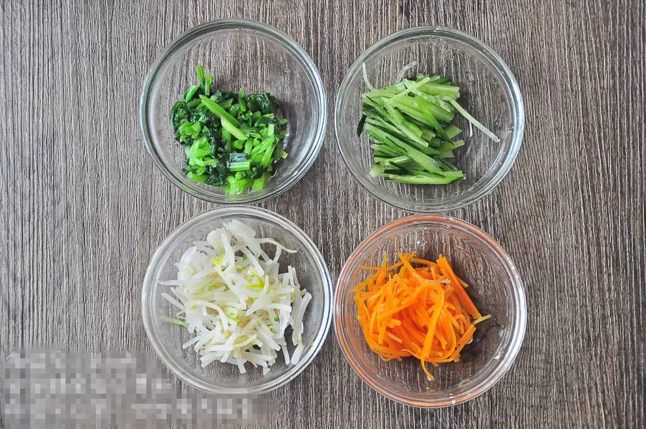 配方:面条70g、鸡毛菜40g、绿豆芽40g、黄瓜20g、胡萝卜20g