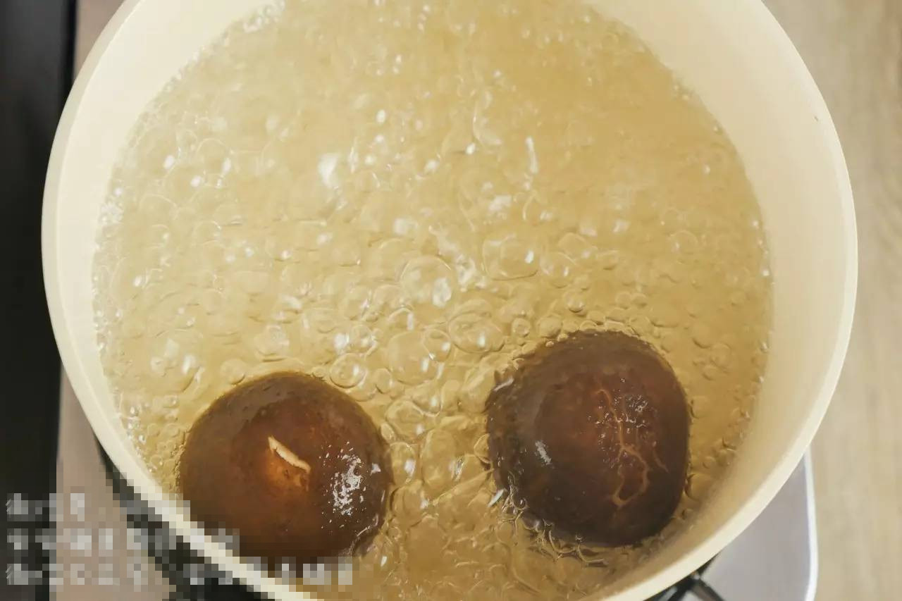 3、锅中放适量的水烧开,将香菇去根后,放入锅中焯水。