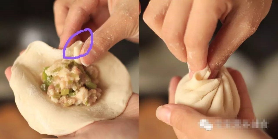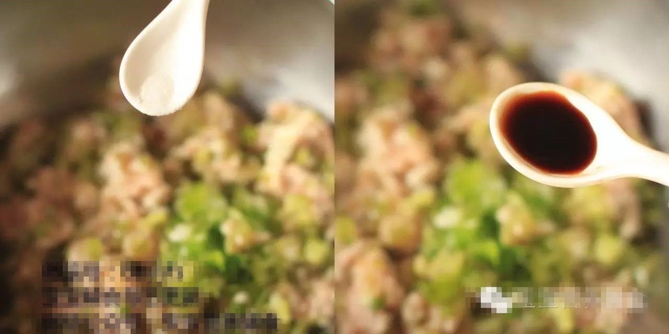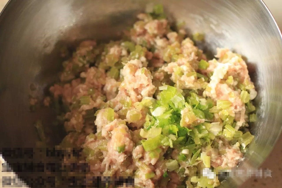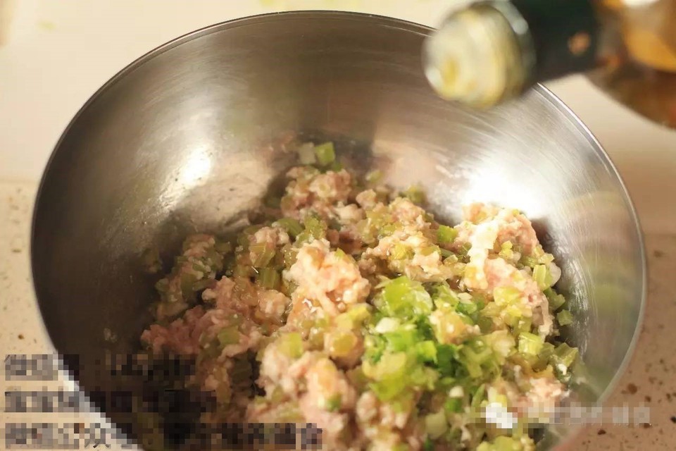 PS:加油和加水的目的是一样的,都是为了让包子馅不会变得非常干。加水的时候,一定要分次加,每次加两勺,然后搅拌均匀,直至让水分吸收。因为芹菜本身会出来一些水分,所以加水的量没办法固定。橄榄油看成分表选择特级初榨的就可以了。