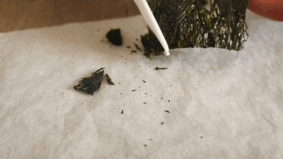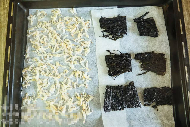 PS:因为紫菜和虾皮一起烘烤,有的时候虾皮的烘烤时间会长一些,最好像我这样将油纸分开,如果觉得虾皮没有烤好,还可以先把紫菜拿走,再继续烘烤虾皮。
