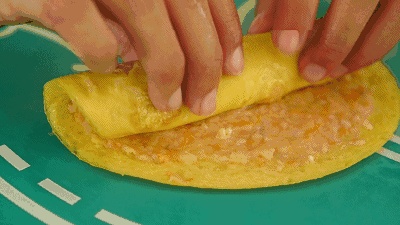 PS:馅料不要铺满蛋皮,在蛋皮的边缘要留出一段距离,这样卷的时候馅料就不容易漏出来了。