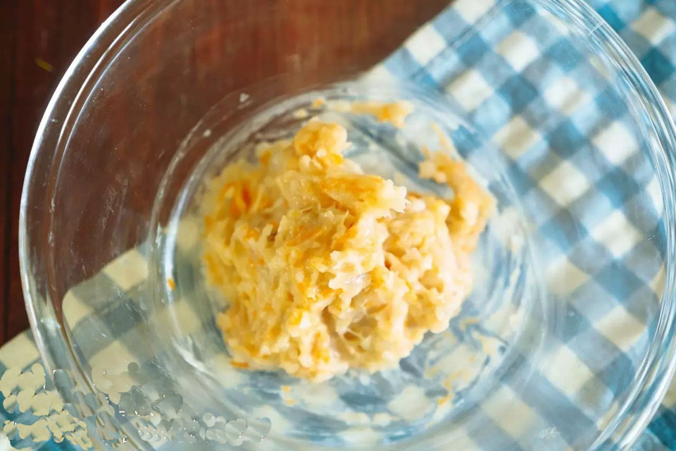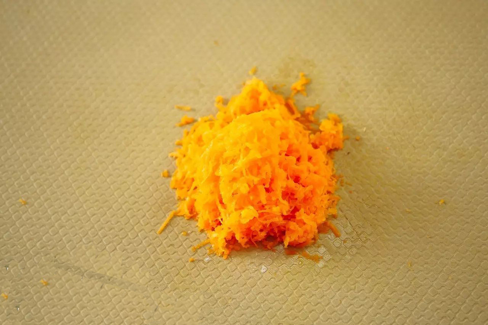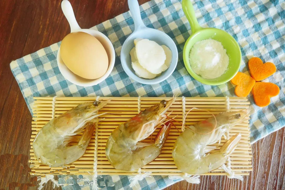 食材:鲜虾3只(去皮后45g),马蹄15g,鸡蛋1个,胡萝卜10g,玉米淀粉8g
