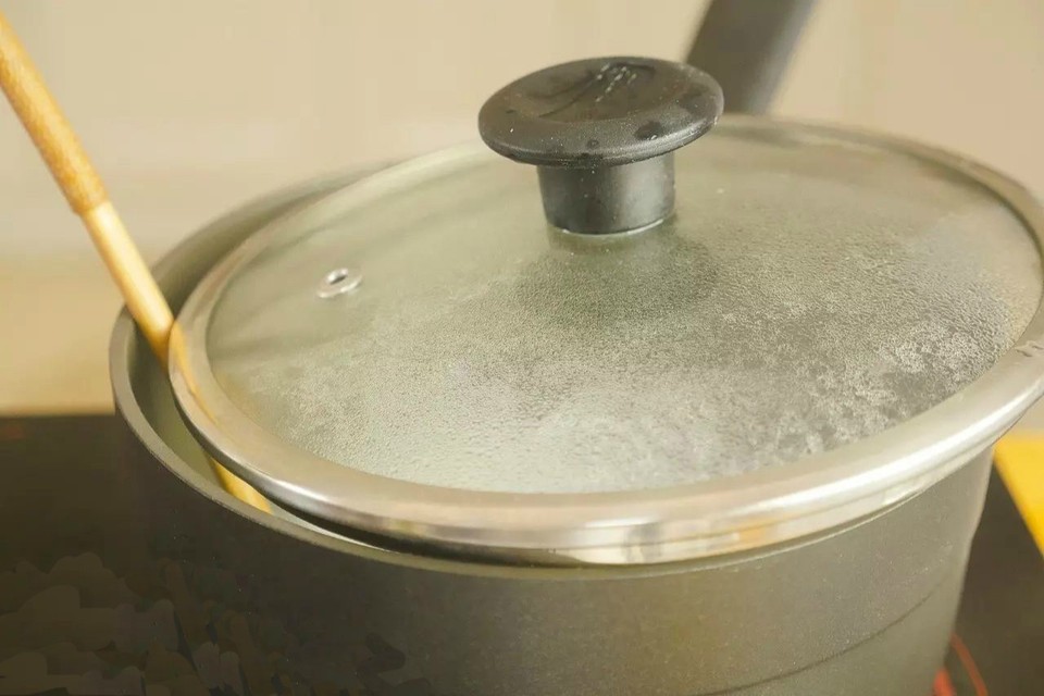PS:用勺子搅拌一下,再用木勺像图上这样倚在锅边,让锅盖漏出一条缝,可以防止溢锅。但如果有时间看锅的话,最好还是不停地搅拌米粥这样防糊锅的效果比较好。