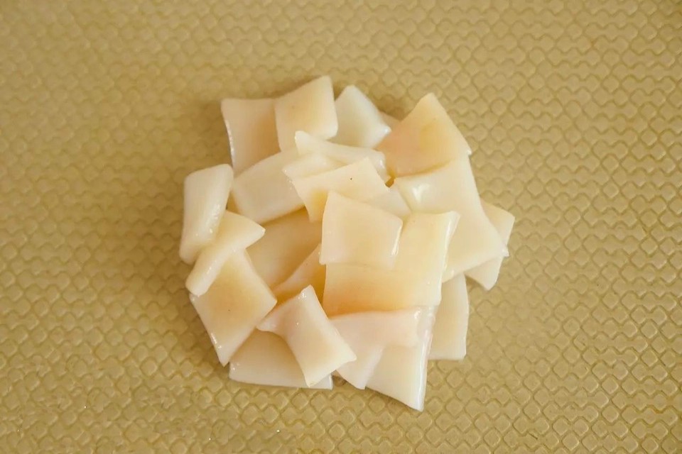 PS:鱿鱼切得小块一些,这样搅拌机能够搅打的动,搅出的鱿鱼泥也会更细腻。