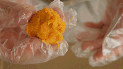 18. 将红薯球压扁成圆饼状,放入红薯馅。