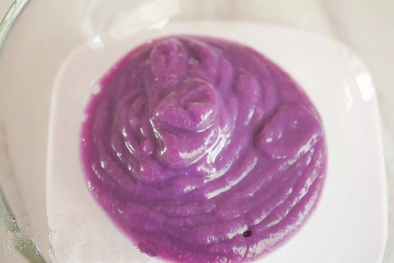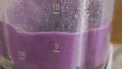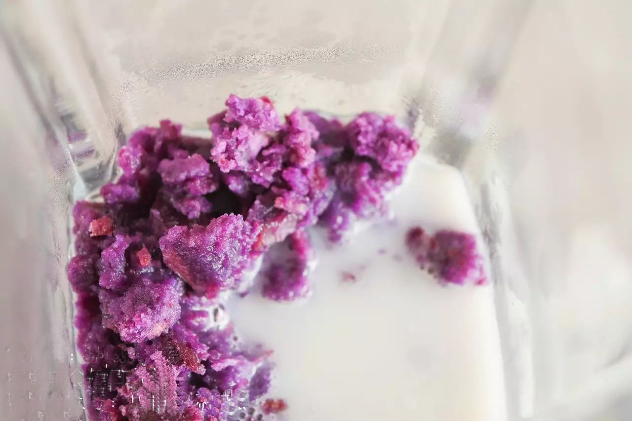 8. 将紫薯稍微碾压成泥变碎,倒入搅拌机中,加入牛奶或者冲泡好的奶粉。