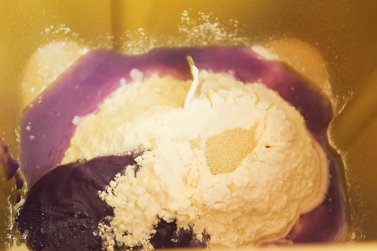 11. 在面包机中加入面粉,倒入搅打好的红薯奶糊,在面粉上挖一个小坑,倒入酵母粉。