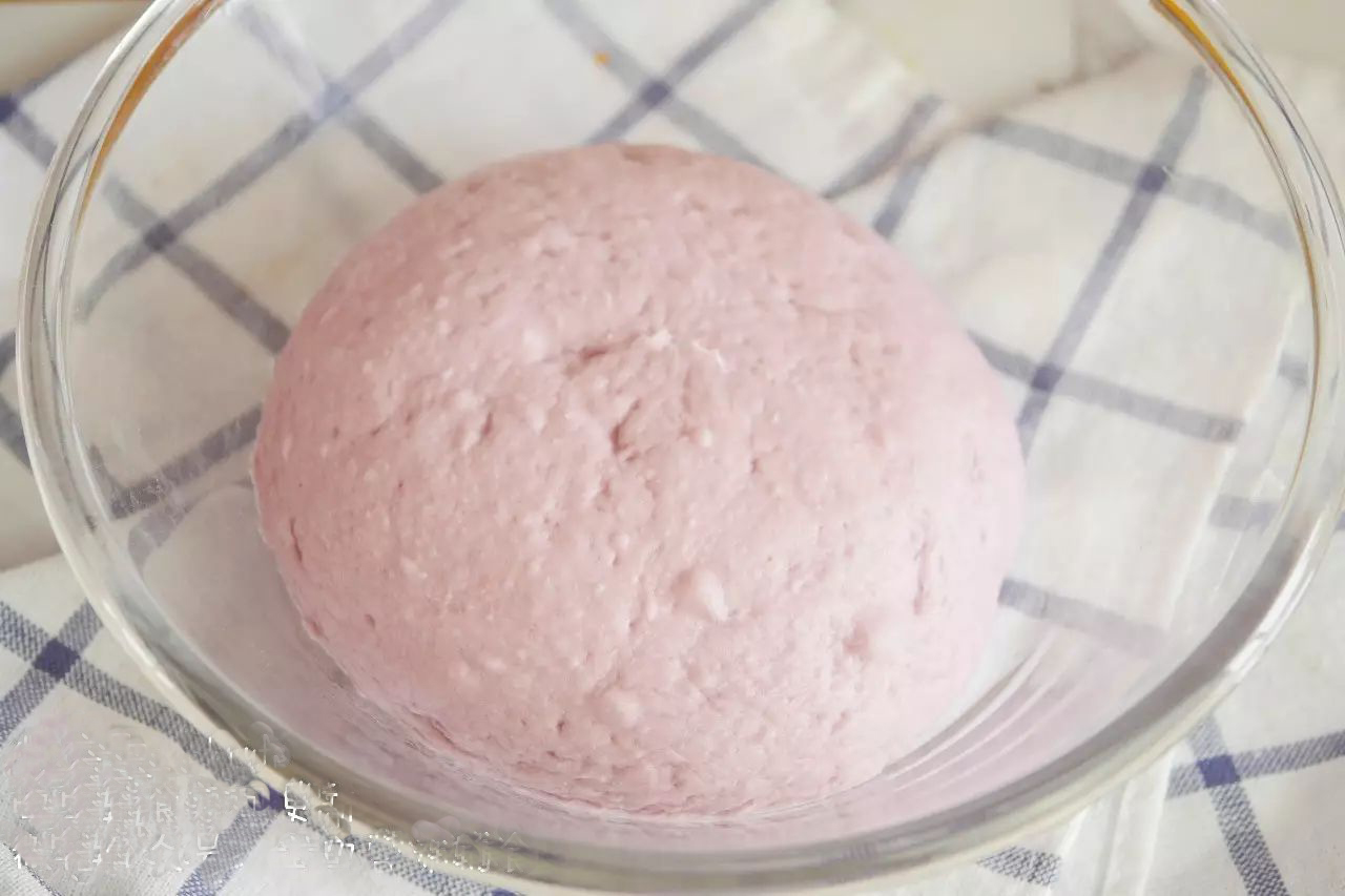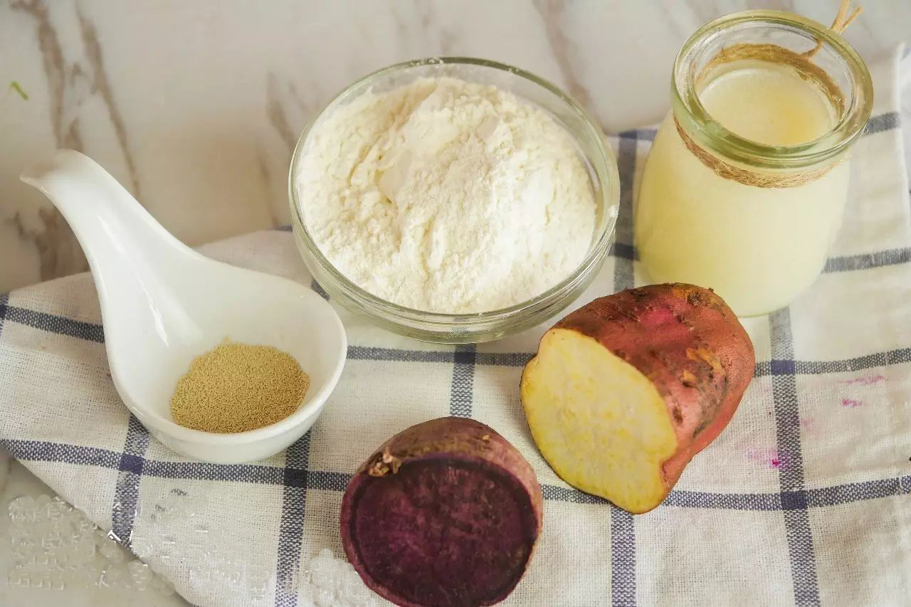 食材:紫薯50g,面粉110g,酵母2g,红薯100g,牛奶或者冲泡好的奶粉60g