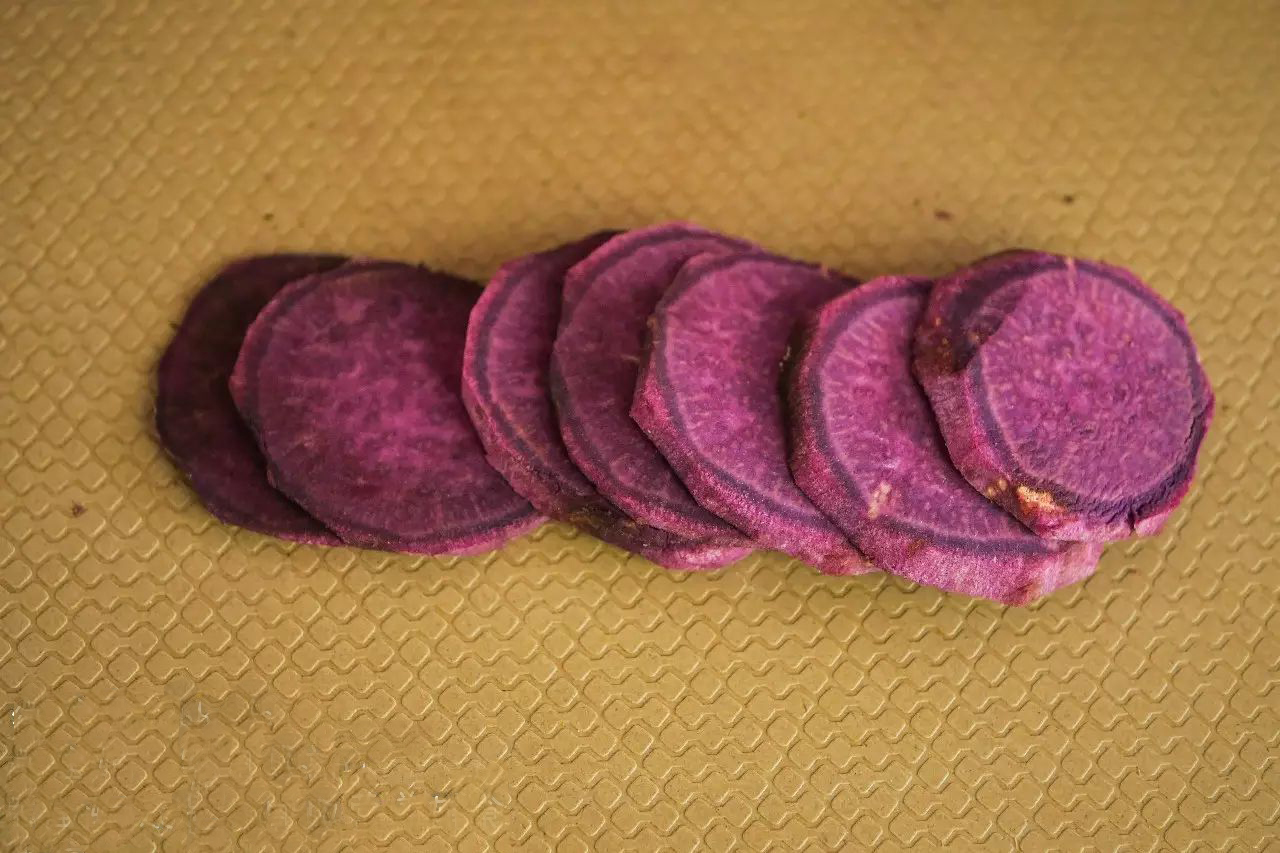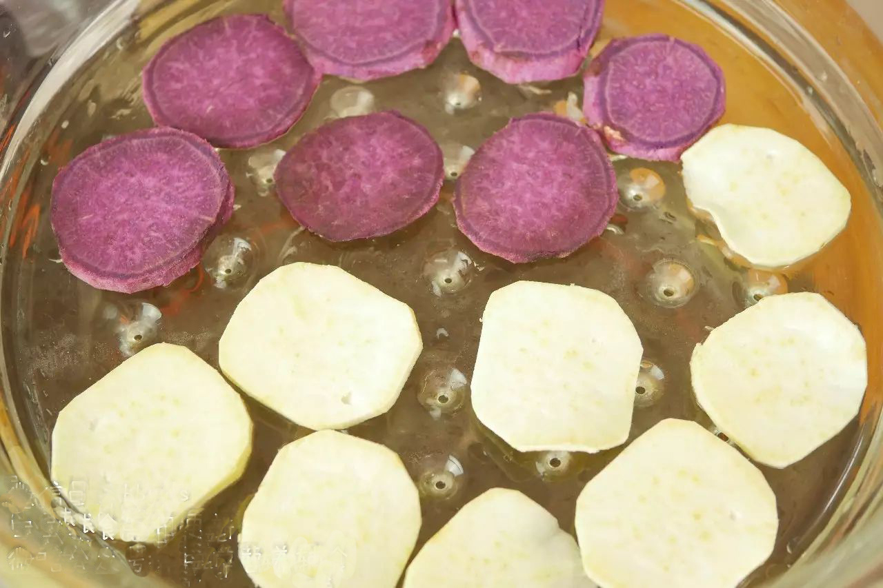 4. 将紫薯和红薯放到蒸锅上蒸15分钟左右,把双薯蒸熟透。