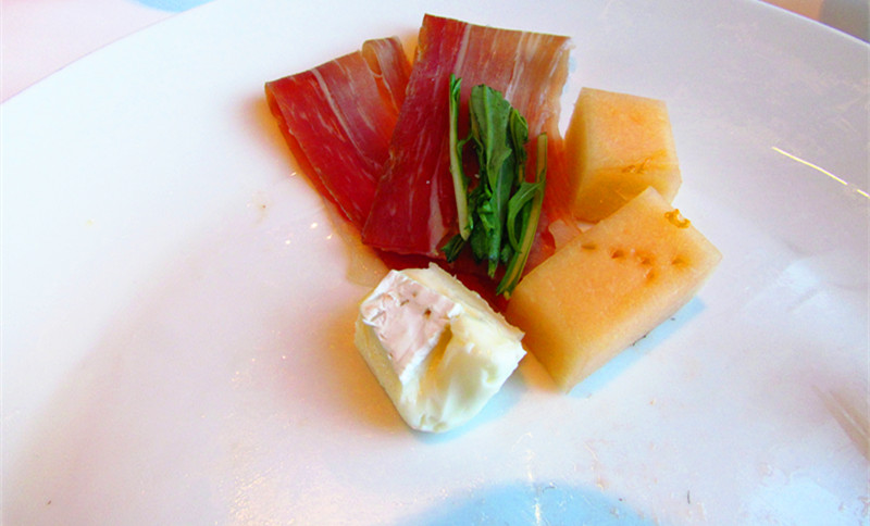 咸咸的火腿薄片与鲜甜的哈密瓜是绝配,没有葡萄酒的芝士,只能来一小点儿。