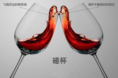 葡萄酒杯不能杯沿相碰,容易碎。要碰杯身较厚的地方——杯肚子。