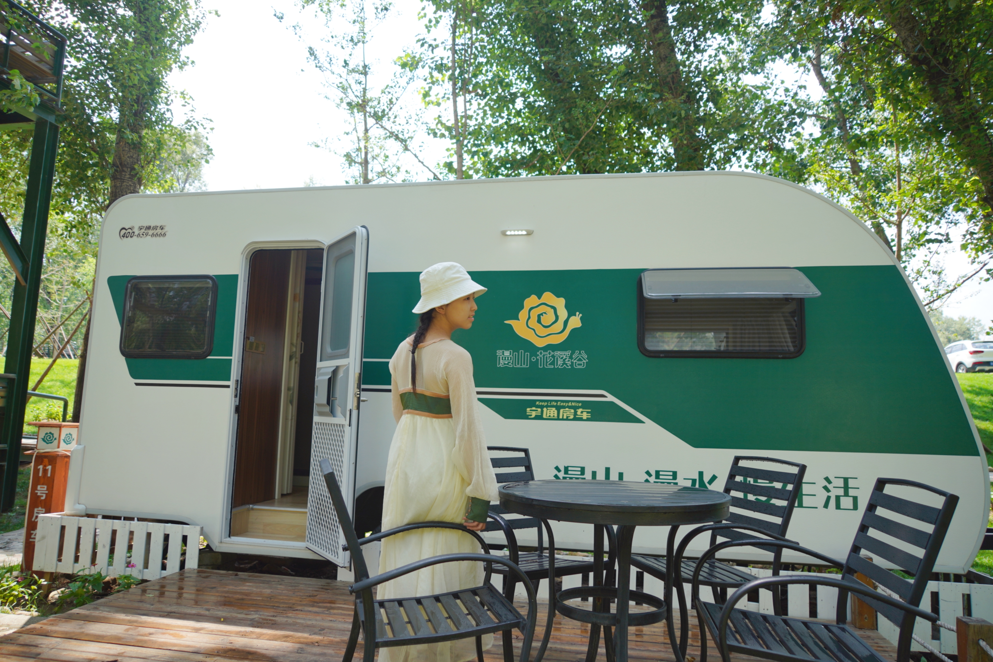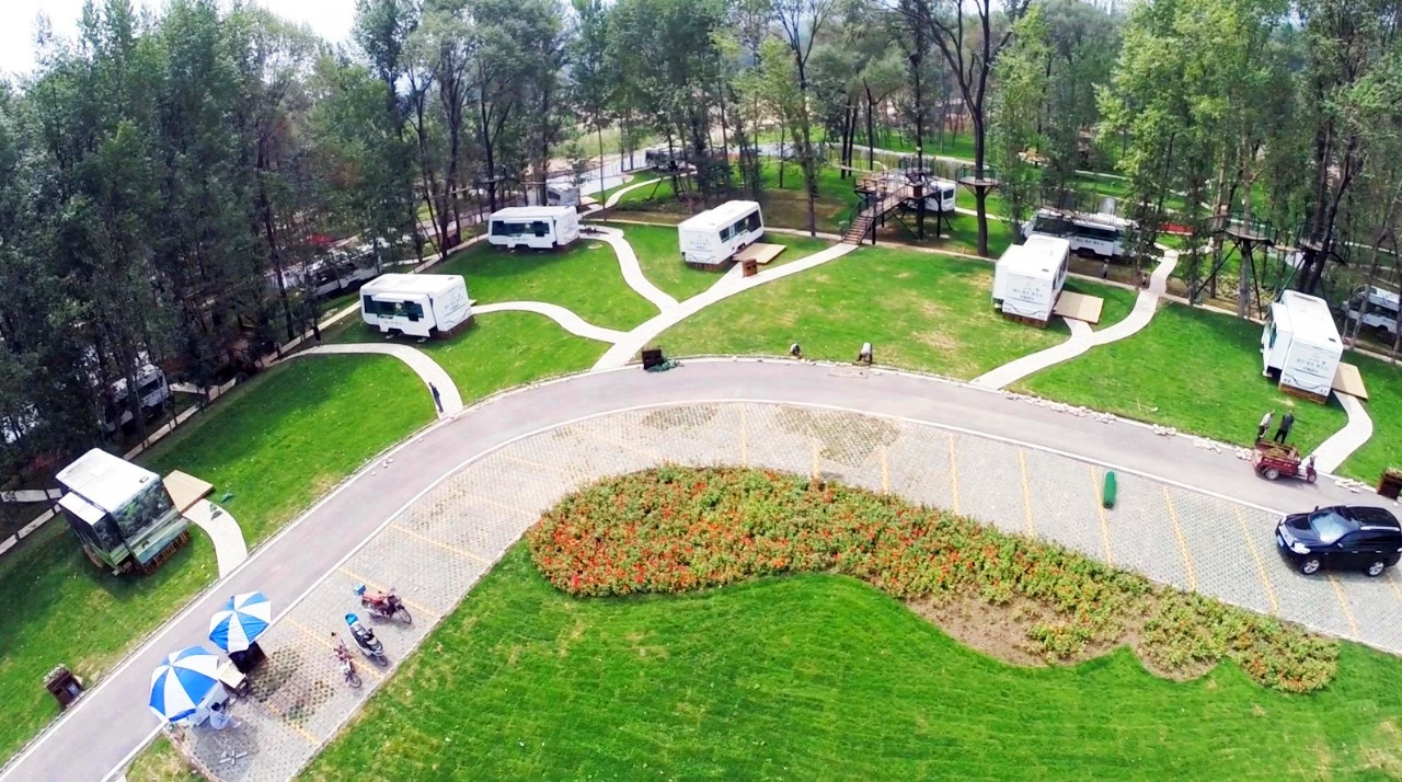 休寻往事话当年,只看今朝,美景无限,房车静静高树前。