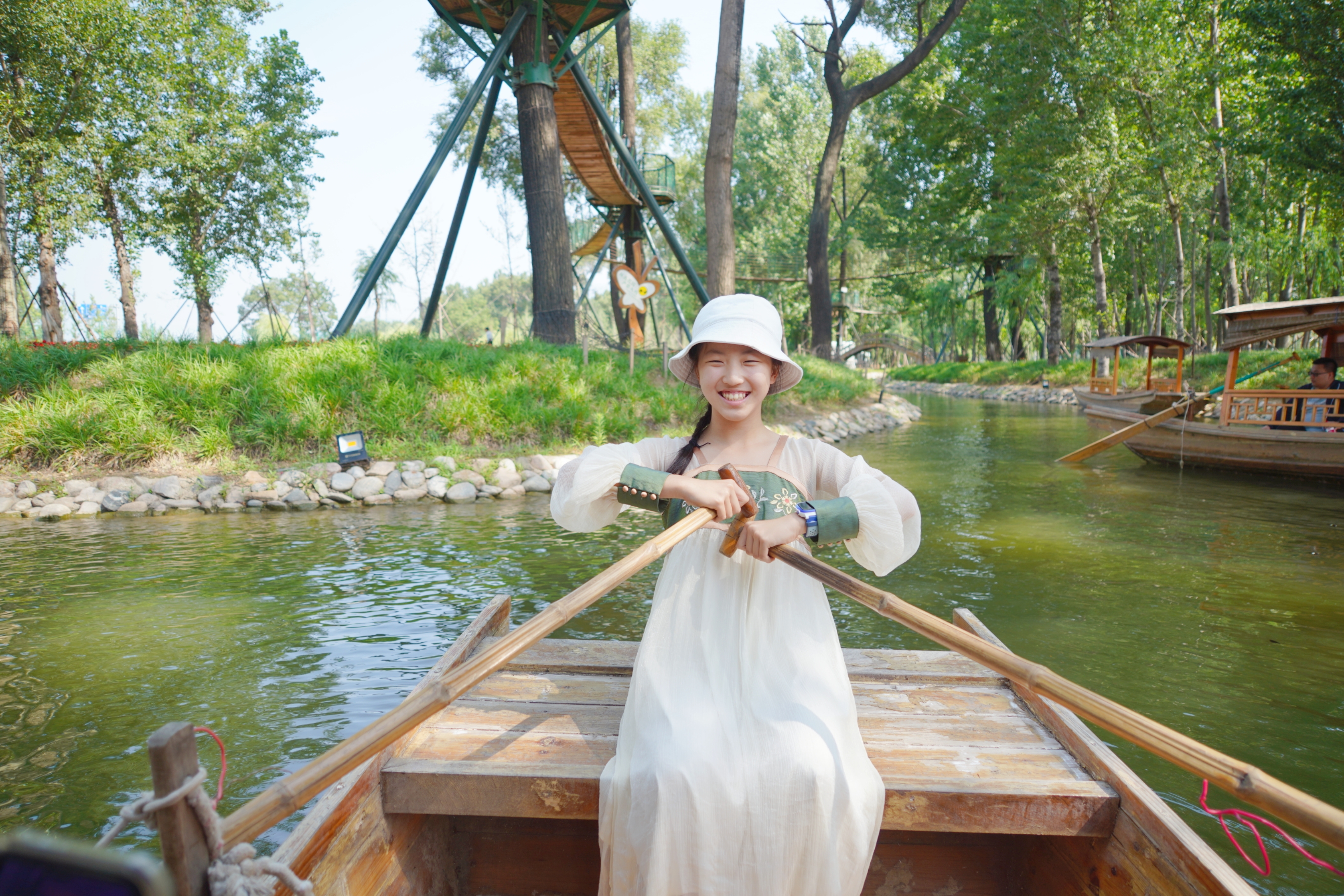 boating and rowing, flowers blooming everywhere, green and