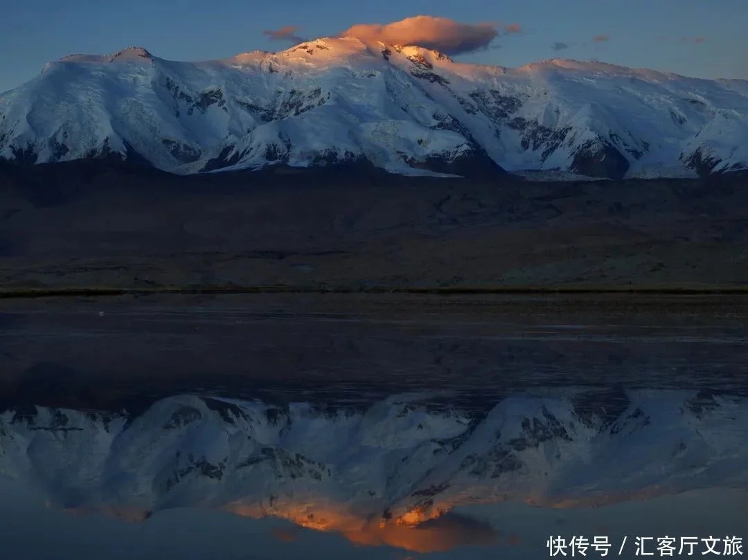 天空如洗水如镜,倒映慕士塔格山。