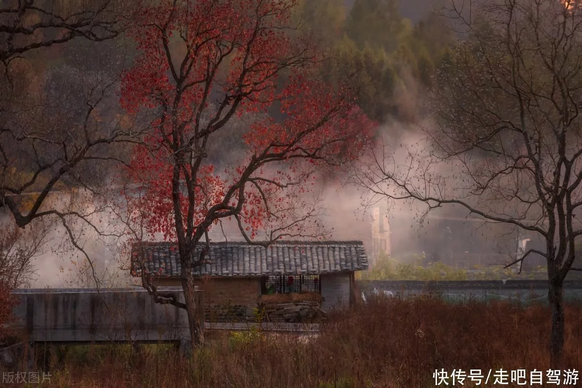 In the early morning, Tachuan Village hid under the red maple leaves.