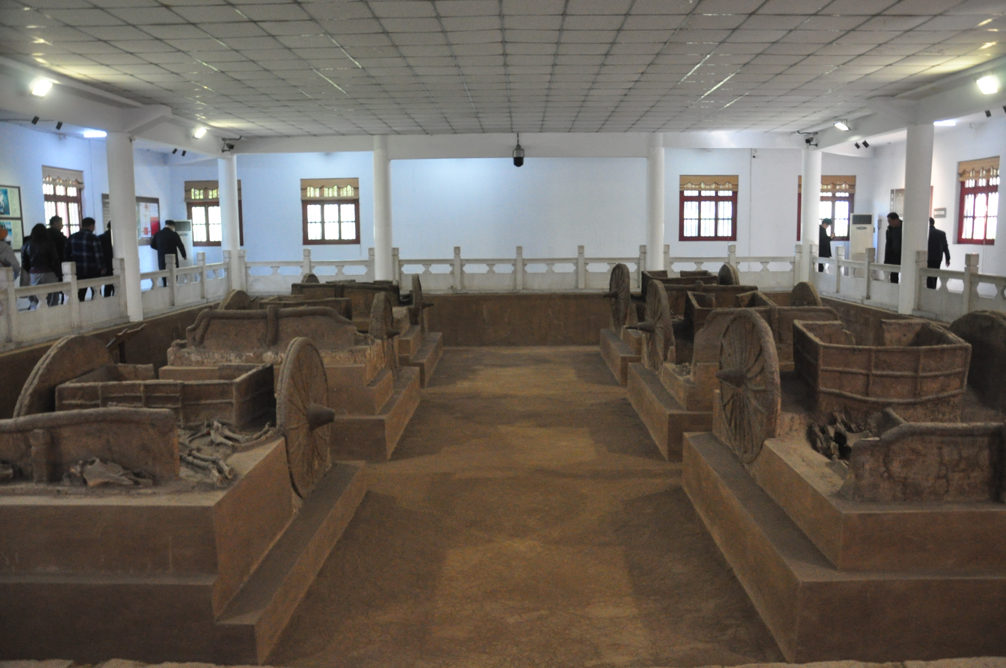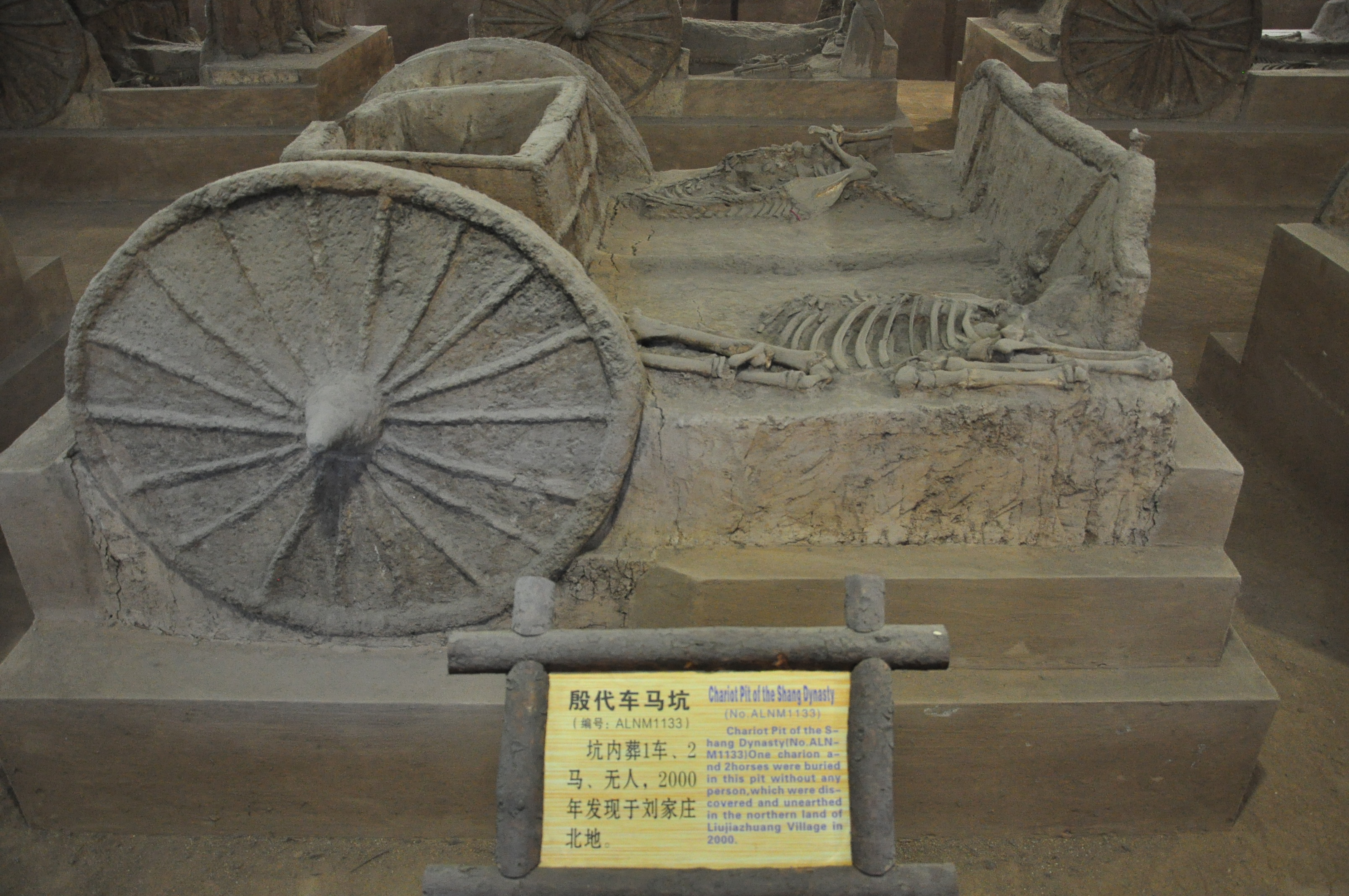二是车马坑展厅,这是当年没有看到过的。殷墟博物苑展出的6座殷代车马坑和道路遗迹,是中国社会科学院考古研究所安阳工作站和安阳市文物工作队分别在安阳刘家庄北地、南地和孝民屯东地发掘的,商代道路遗迹是在滑翔学校南地发掘的。这几座车马坑,保存基本完整,具有较高学术研究和展示价值。每坑葬1车,其中5坑随车皆葬两马,4坑各葬1人。经鉴定,殉人中多为成年男性,另有1少年男性。研究证明,殷代的马车造型美观,结构牢固,车体轻巧,运转迅速,重心平衡,乘坐舒坦。殷代车马坑不仅展示了上古畜力车制的文明程度,同时也反映了奴隶社会残酷的杀殉制度。它是国人最形象的历史教科书。