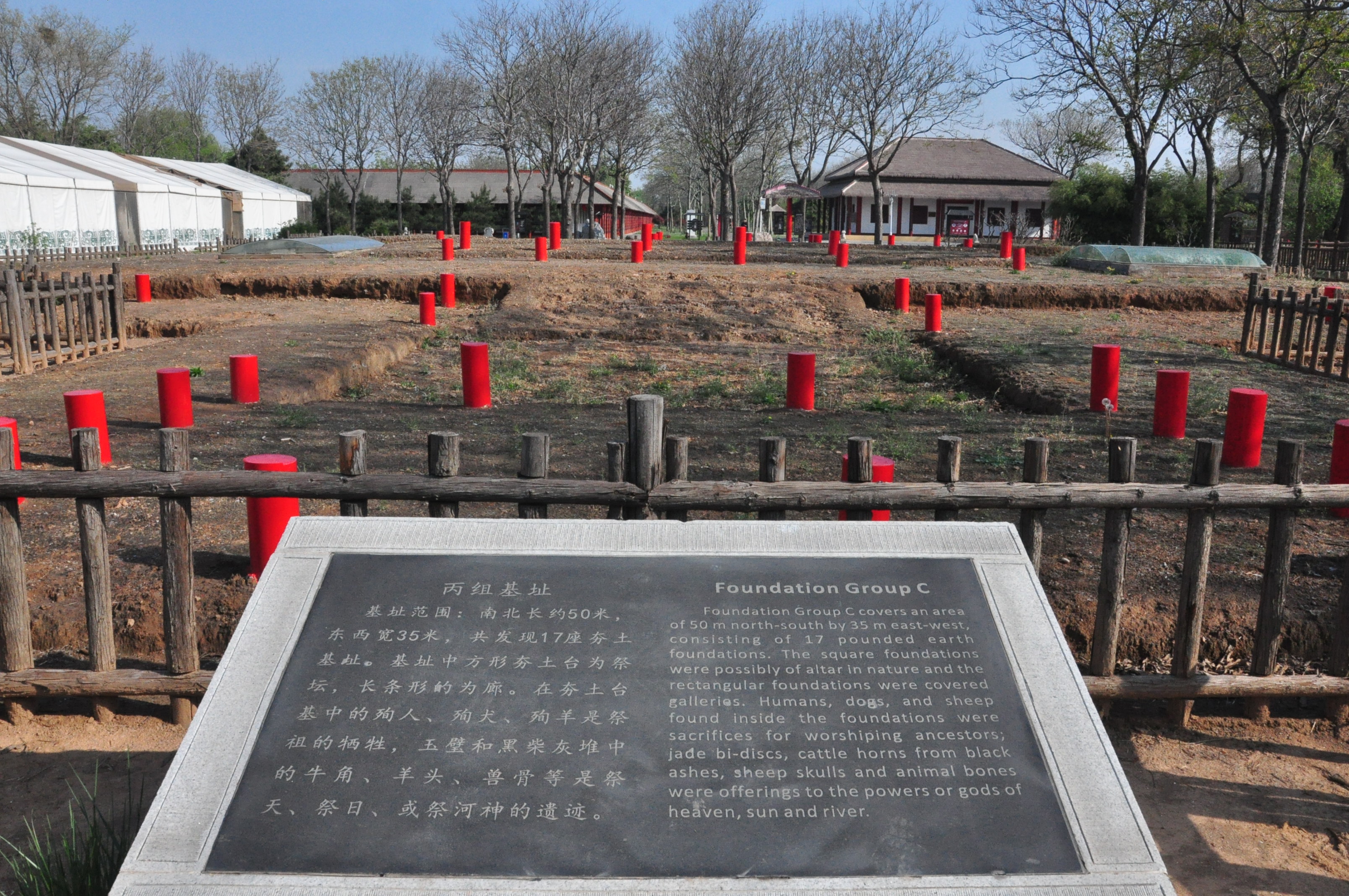 殷墟宫殿宗庙遗址景区,就建在殷墟宫殿宗庙区内,是世界文化遗产、国家5A级旅游景区、中国考古学的诞生地、甲骨文发祥地,是中宣部公布的全国百个爱国主义教育示范基地之一,首批全国旅游景区级青年文明号,属历史遗址类型的全国重点文物保护单位。1973年以前这里发掘的53座建筑基址,是殷墟宫殿宗庙区的主体和殷王都全盘规划、布局结构的重心所在,被考古学者划分为甲、乙、丙三组基址。甲组建筑基址共发现15座,是宫殿宗庙区内建设时间最早、使用时间最长的建筑,被认为是商王室的宫室、寝居之所。乙组建筑共发现21座,多数结构繁复,面积巨大,互相连属。这些建筑被认为是殷王室的宗庙建筑。丙组共发现17座,被认为是商王室的祭坛建筑。目前,在宫殿宗庙区已发现大型夯土建筑基址80余座。这些建筑基址形制阔大、气势恢宏、布局严整,按照中国古代宫殿建筑“前朝后寝、左祖右社”的格局,依次排列,分布在以宫殿区为中心的范围内。